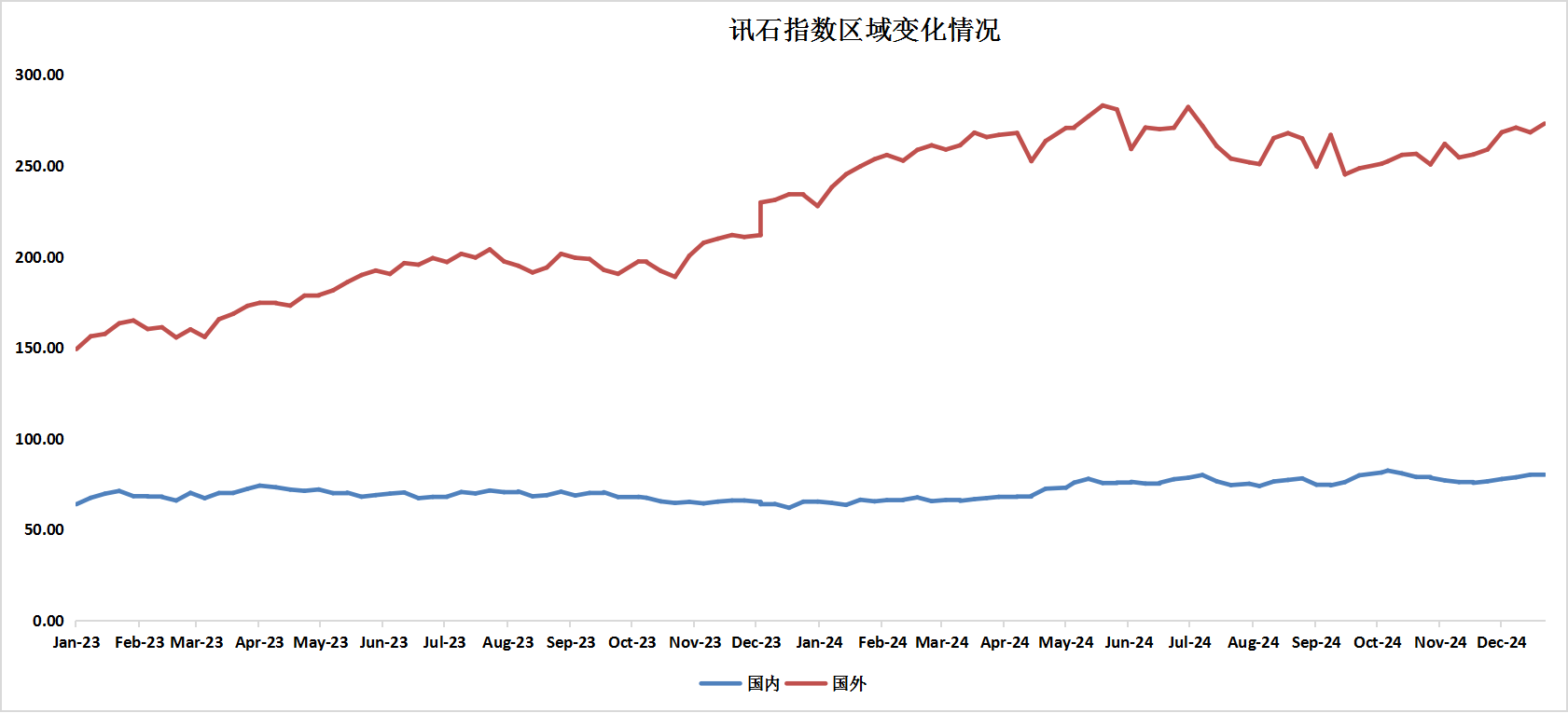 按地區(qū)劃分,截止到12月27日,ICC所統(tǒng)計(jì)的國內(nèi)通信指數(shù)為80.54,環(huán)比增長5.34%。國內(nèi)指數(shù)呈現(xiàn)平穩(wěn)趨勢(shì)。國外通信指數(shù)為273.13,較上月增長5.5%。國外指數(shù)呈現(xiàn)增長趨勢(shì)。