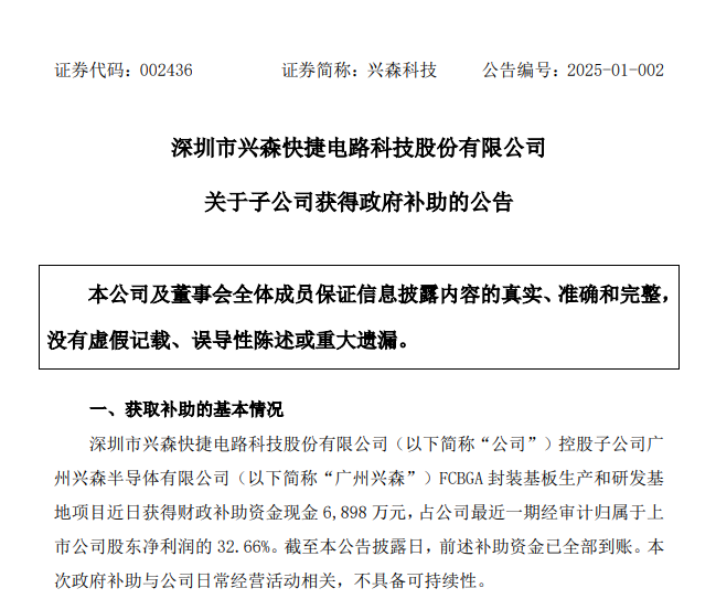 ICC訊 1月7日晚間,深圳市興森快捷電路科技股份有限公司(簡稱“興森科技”或“公司”,002436)發(fā)布關(guān)于子公司獲得政府補(bǔ)助的公告,公司控股子公司廣州興森半導(dǎo)體有限公司FCBGA封裝基板生產(chǎn)和研發(fā)基地項(xiàng)目近日獲得財(cái)政補(bǔ)助資金現(xiàn)金6898萬元。此次政府補(bǔ)助預(yù)計(jì)增加公司2024年度利潤總額6898萬元,對凈利潤影響約為2710萬元。