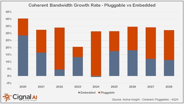 自2022年引入專為直接交換機和路由器設計的400ZR光學之前,幾乎所有的帶寬增長都是由嵌入式光學器件提供的。到了2023年,隨著800G嵌入式解決方案的增長以及100G/200G可插拔的減少,嵌入式解決方案相對于可插拔的增長有所上升,但這種情況在一年后發(fā)生了巨大變化。