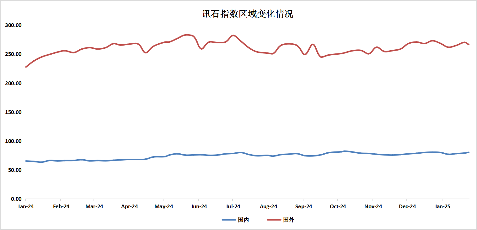 按地區(qū)劃分,截止到1月28日,ICC所統(tǒng)計的國內(nèi)通信指數(shù)為80.35,環(huán)比下滑0.24%。國內(nèi)指數(shù)呈現(xiàn)平穩(wěn)趨勢。國外通信指數(shù)為266.47,較上月下滑2.44%。國外通信股指在波動中呈現(xiàn)下滑趨勢。