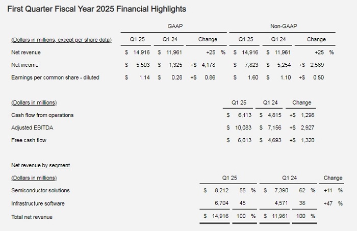 ICC訊 美國加利福尼亞州帕洛阿爾托,2025年3月6日 — 博通公司(Broadcom Inc.,納斯達(dá)克股票代碼:AVGO),一家設(shè)計(jì)、開發(fā)和供應(yīng)半導(dǎo)體及基礎(chǔ)設(shè)施軟件解決方案的全球技術(shù)領(lǐng)導(dǎo)者,今日公布了截至2025年2月2日的2025財(cái)年第一季度財(cái)務(wù)業(yè)績。