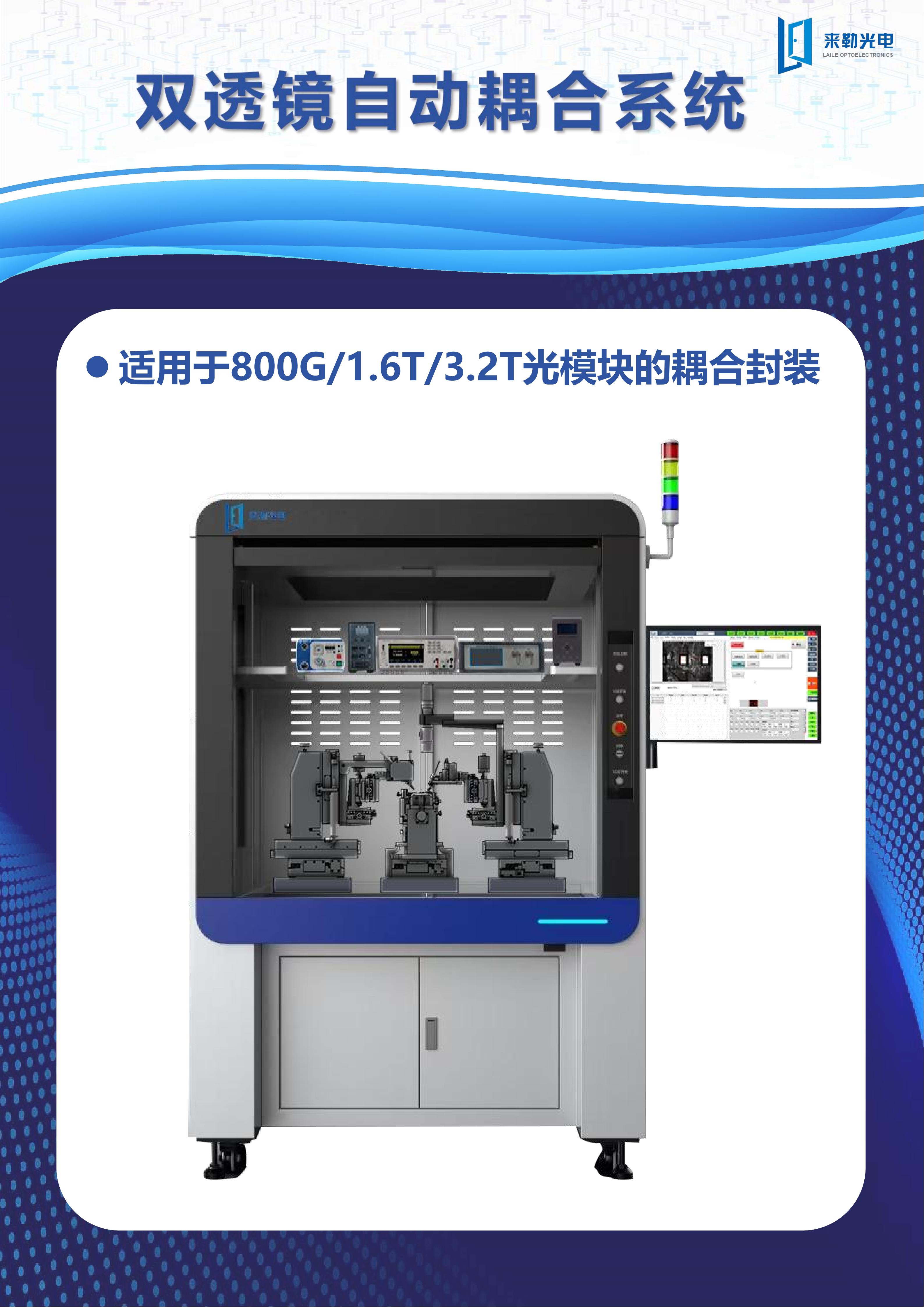 ICC訊 面對AI算力集群驅(qū)動的光模塊需求爆發(fā)式增長,800G、1.6T光模塊需求遠超預期,來勒光電自主研發(fā)的雙透鏡自動耦合封裝系統(tǒng),能夠很好解決光模塊耦合封裝效率難題,設備具有高精度圖像識別和定位功能,實現(xiàn)自動化上料、自動點膠與自動UV固化功能。設備可一次性上料5組模塊,操作便捷,一人可同時操控5臺設備,極大地提高了生產(chǎn)效率,節(jié)省人工。目前已廣泛應用于800G/1.6T/3.2T光模塊的耦合封裝。