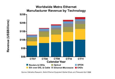 CAMPBELL, California, May 6, 2008—Worldwide metro Ethernet equipment sales hit $13 billion in 2007, up 27% from the previous year, and are projected by analyst firm Infonetics Research to continue growing in the double-digit percents over the next 4 years.